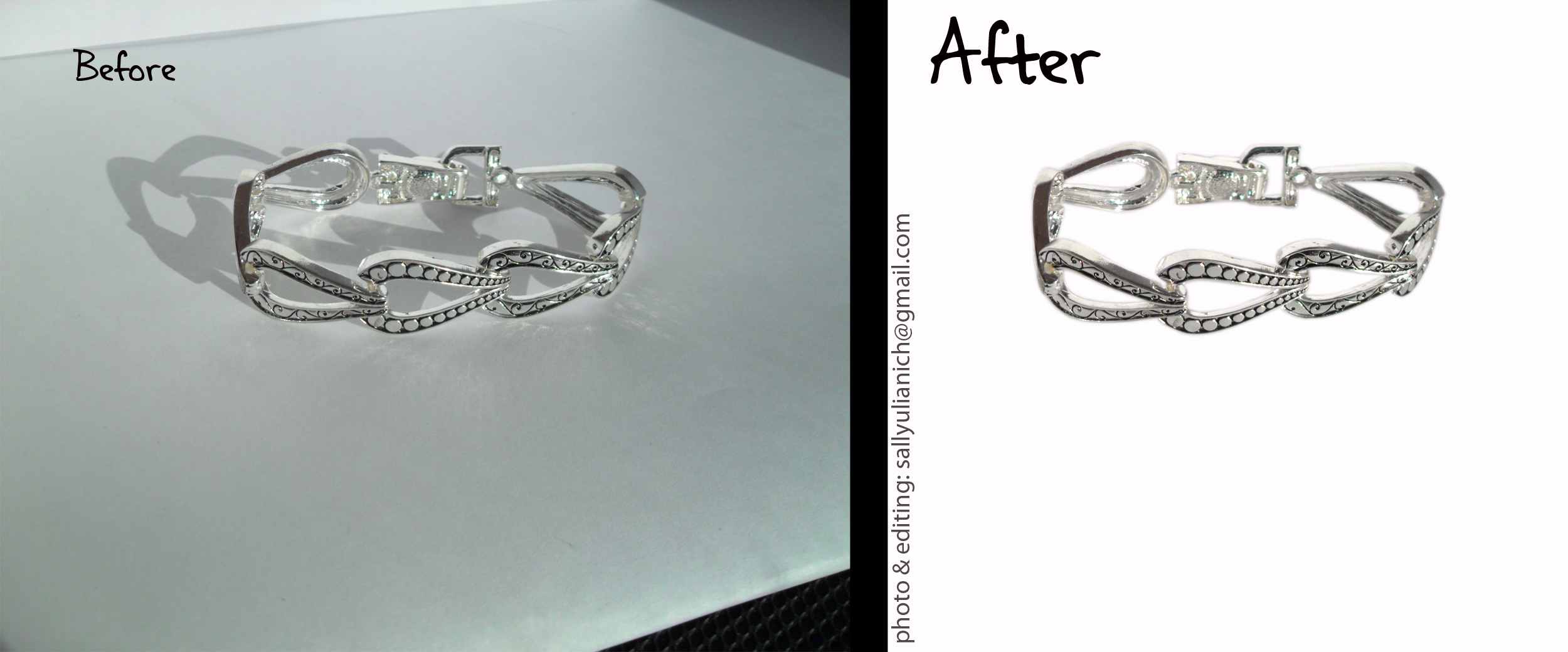 Below is a before and after image I did. My photography booth wasn’t set up at the time, so I took the photo in the sun room for natural lighting, but it added a bunch of shadows. I corrected the color using levels, then removed the background using the pen tool.