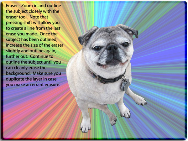 2. Eraser Tool: So if the magic eraser tool isn’t the cleanest, the eraser tool is a good option, right? Well it is an acceptable option, but not one of my top options because of all the work it requires to do a good job with it. I am also hesitant to erase part of a photo because of the likelihood of erasing too much and not being able to easily fix it. For all the work that goes into using the eraser, you’d be better off using one of the other methods below for a much nicer result.