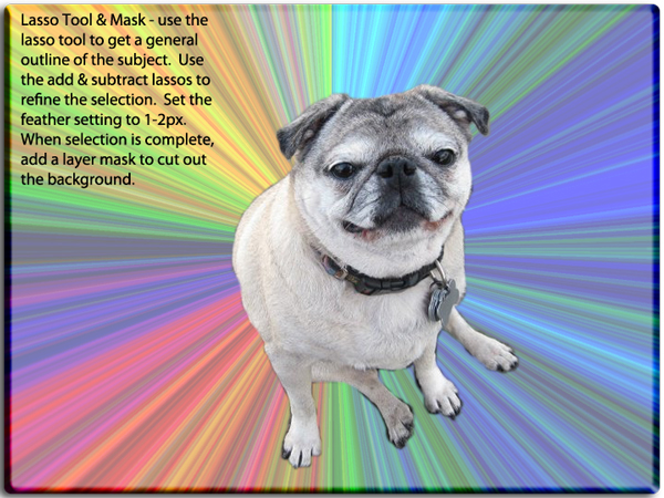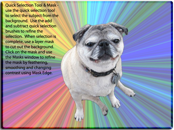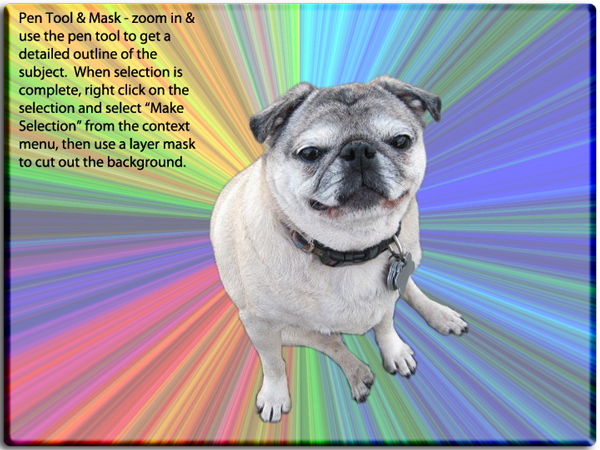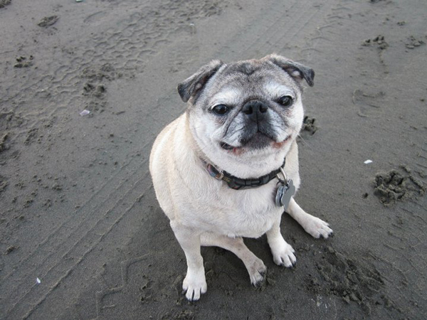 Below is my starting photo, my pug Mushi at the ocean last summer. I chose this photo because the background color blended at some points with her coloring so this would be a somewhat difficult task for a novice. I also picked a pretty radical background to lay behind the photo to show the effectiveness of my background removal options.