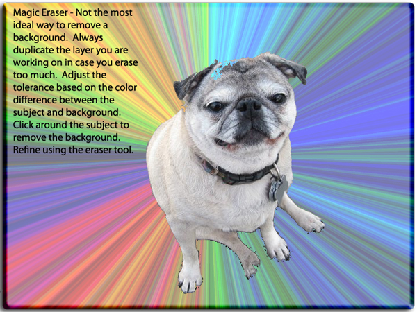 1. Magic Eraser: I’ve mentioned before that I’m not a fan of the Magic Eraser tool and the photo below is exactly why. Photos in which the subject has a similar color as the background just will not erase well using the magic eraser because you need to set the tolerance quite low so you end up getting really blotchy results. Even using the regular eraser tool requires a lot of work to clean up the mess you’ve created using magic eraser and by the time you start cleaning up the photo, chances are you’ve already erased part of your subject.