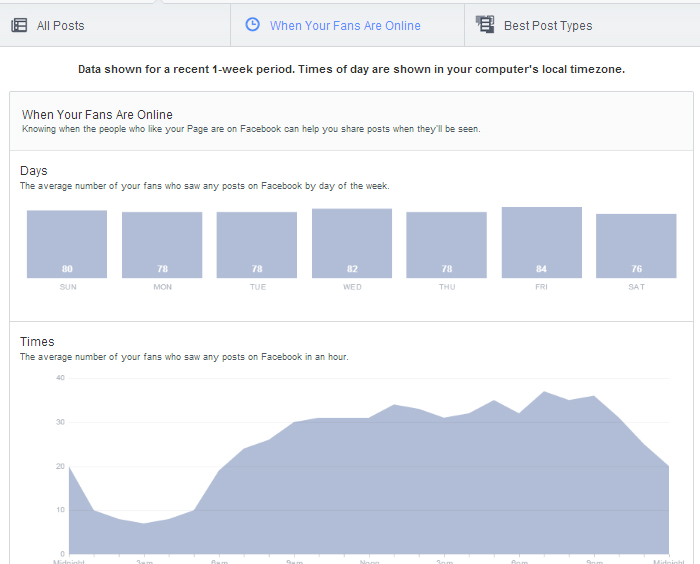 Remember, posting when your fans are online is useless if your posts aren’t engaging. Continue to check the success of your posts and review your best types of posts using the Facebook Insights tool to ensure you are posting what your fans are interested in seeing. Also remember that what works today may not work 3 months from now, so continue to monitor your insights and adjust your types of posts for best results.