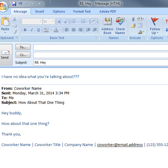 Find an email your office buddy sent you and change the contents from their sent mail to look like you’re responding to an email they sent you that really doesn’t make any sense. They will go nuts trying to figure out what’s going on. Tip: keep it clean, office-friendly and preferably cryptic, so cryptic they don’t even remember what they were talking about. Because they won’t remember. Because they didn’t send it.
