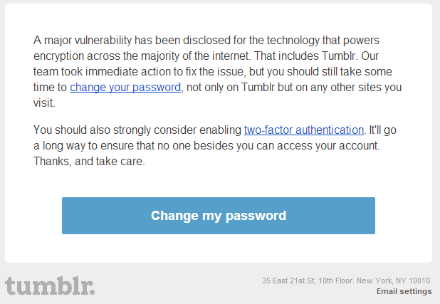 “A major vulnerability has been disclosed for the technology that powers encryption across the majority of the internet. That includes Tumblr. Our team took immediate action to fix the issue, but you should still take some time to change your password, not only on Tumblr but on any other sites you visit.