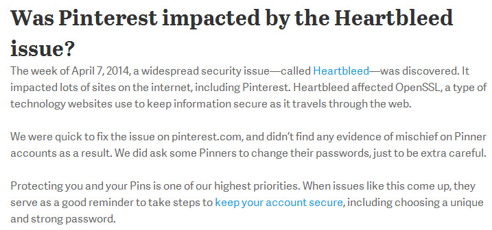 In regard to the recent Heartbleed bug discovery, I’ve received notifications from some sites, such as Tumblr and Pinterest about changing my password, however according to a post in Pinterest help, not all users may have received this email.