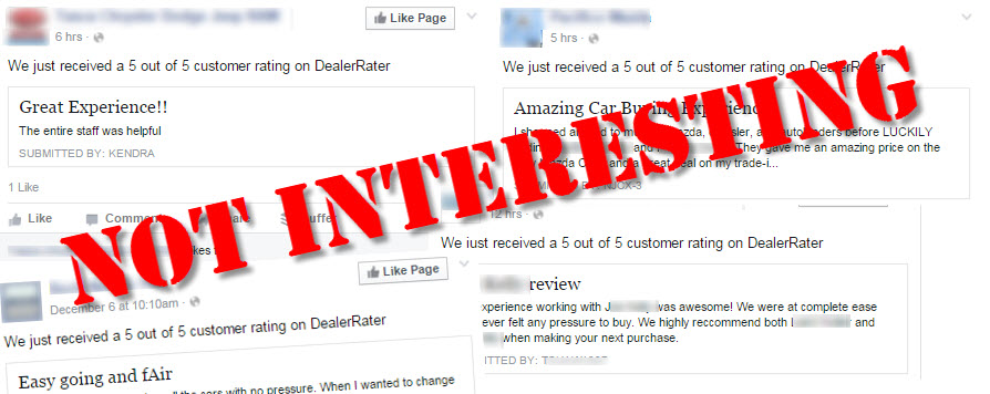 For example, if you follow any dealerships on Facebook, chances are you’ll occasionally see the following post: “We just received a 5 out of 5 customer rating on DealerRater.” If you Google that exact phrase, there’s over 11,000 results. So if you’re doing this, you’re not alone; but you’re not helping yourself either.
