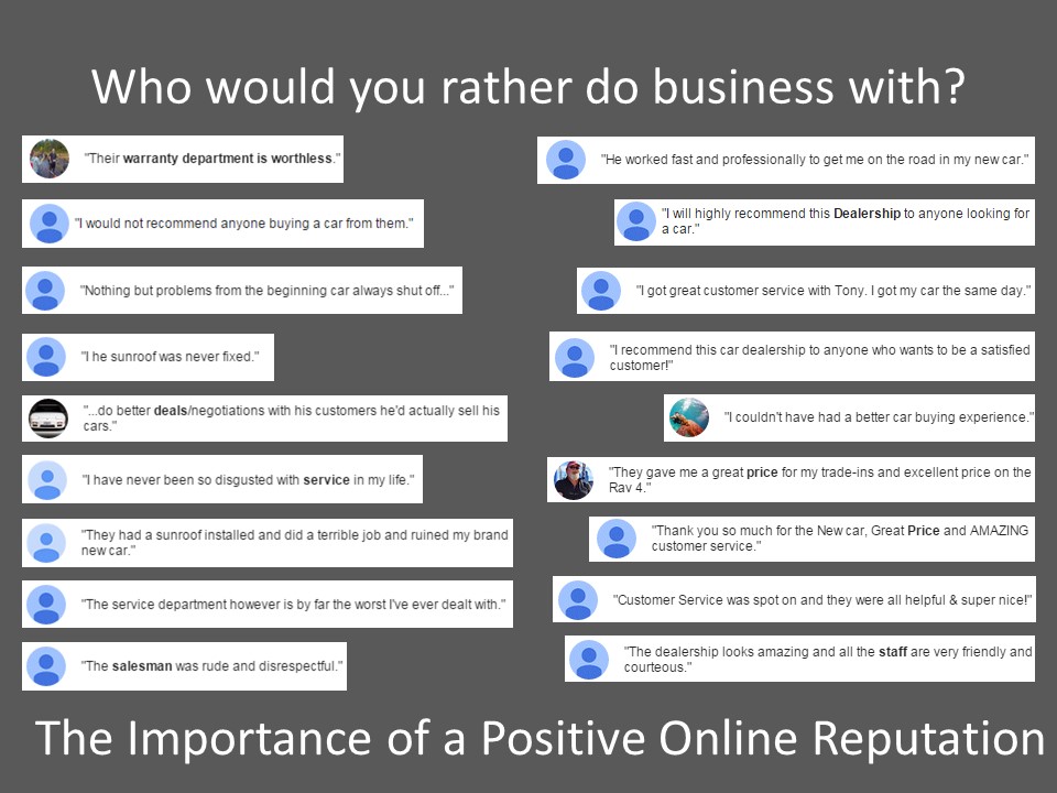 The majority of consumers are deciding whether or not they trust you to do business with before they’ve even talked to anyone at your dealership. And if your online reputation is poor, you may never get the chance to do business with them.